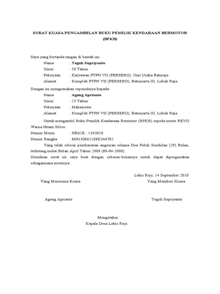 Namun, jika proses pembayaran dilakukan oleh orang lain, anda perlu mempersiapkan dokumen tambahan berupa surat kuasa. Bukti pembayaran pajak motor ini harus dibawa karena menunjukkan pemilik kendaraan sudah membayar pajak di tahun sebelumnya. Contoh surat kuasa pengacara untuk kepengurusan hukum contoh surat kuasa pengambilan uang di bank bni, mandiri, bca, bri Kesibukan atau suatu hal yang penting dan tak dapat ditunda lagi terkadang menjadi kendalan dalam membayar pajak kendaraan motor atau mobil. Contoh surat kuasa pengurusan pajak kendaraan mobil & motor.